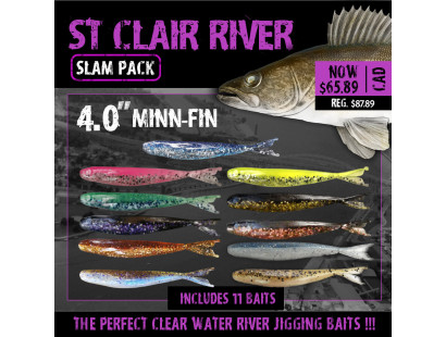 The ST.CLAIR RIVER WALLEYE: MINNOW SERIES SLAM PACK consists of our top eleven (11) colors of our popular Minn-FIN minnow-style bait. The color selection covers a full ranges of conditions you might find fishing the St.Clair River.